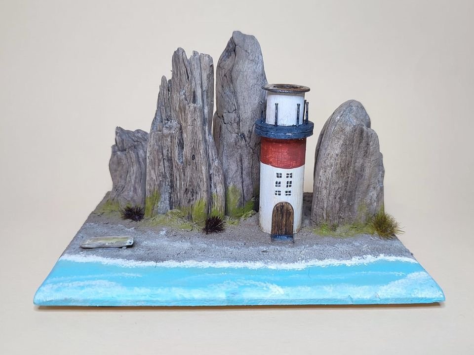 Sehr schöne und aufwendige gearbeitete Miniaturwelt mit Leuchtturm und imposanten "Klippen / Felsen aus echtem Treibholz im Hintergrund, Miniatur- Holzdeko, Miniwelt auf Treibholz“Shabby Style” mit vielen aufwendigen und liebevollen Details.Alle stabilen Aufbauten wurden in Handarbeit gefertigt und auch handbemalt.Einzelstück! Neuware! HandmadeDie spektakulär geformten und von der Zeit gefärbten Treibholzstücke, dienen als eindrucksvolle Kulisse für diese kleine Szenerie. Die verwitterte Oberfläche hat auch Risse etc...Maße maximal ca. 15 x 11 x 10 cm (Breite, Tiefe, Höhe)Unsere einzigartigen maritimen Miniwelten auf spektakulären Treibholzstücken / Treibholzskulpturen nehmen Dich mit in eine faszinierende Szenerie mit vielen, kleinen Details und landschaftlichen Highlights.Wir fertigen diese Miniaturen von Hand mit einem guten Blick für besondere Akzente. Jedes Stück ist ein Unikat…Bitte schauen Sie sich auch unsere anderen Produkte an :-)• Miniatur auf Treibholz Handmade! • Holzdeko, Miniatur Holz Deko • Atlantik, Ostsee, Nordsee, Holzlandschaft • maritime Deko, Diorama, Waterkant, Stillleben • Treibholz Skulptur, Treibholz Dekorativ • Leuchtturm Deko, Leuchtturm Modell, Leuchtturm Maritim • Treibholz Wohnaccessoirs, Treibholz Tischdeko • Handgefertigte Treibholz Deko • Natürliche Treibholz Deko
